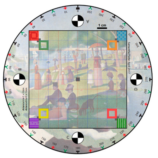 The method of preparing milk powder samples in this study is the same as the method used in a previous study [48]. To duplicate the experience of a representative customer, the Fonterra Co-operative milk powders used were purchased off the shelf from a local Auckland, NZ, superstore. These milk powders comprise both instant whole and instant trim milk powders which allows the investigation of the effects of moisture level on the surface texture of various types of milk powders. The milk powders bought have similar moisture levels, though the surface texture properties of the milk powder samples may be different due to different moisture levels [48]. Therefore, to artificially create milk powders purchased at different locations and seasons, with corresponding differing moisture levels and surface appearances, varying amounts of water were sprayed on the samples. To assess the actual moisture level of each milk powder sample, three replicates of samples were dried in an oven (Cole-Parmer, Vernon Hills, IL, USA) [49,50] after photogrammetry tests, where the mass difference before and after drying is the weight of moisture contained, and the mean of three values was used. Four moisture levels were manually made in both samples (instant whole and instant trim milk powders), and these surface roughness grades are denoted as original, smooth, medium, and rough, where the first surface roughness grade (original) are the original milk powders. Three replicates of analysis were made for each moisture class for repeatability. Figure 1 shows the calibration chart with a somewhat arbitrarily chosen background image [48] which is subsequently in the image processing algorithm to robustly differentiate specific reference points. The squares of different colors in Figure 1 are used to distinguish the location of the model when building 3D models of milk powder samples.