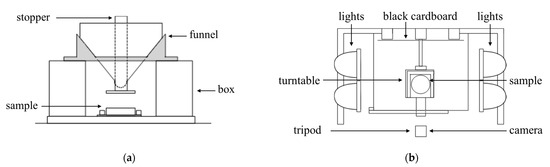 (a) The diagram of the milk powder delivery device; (b) A plan view of the photogrammetry equipment and sample stage.