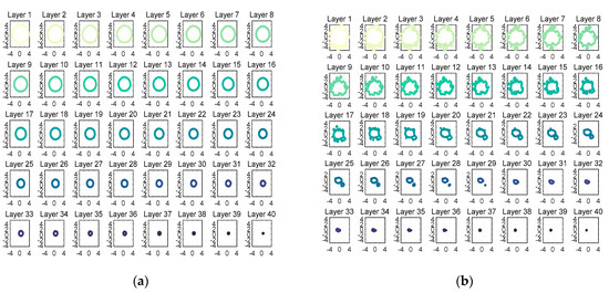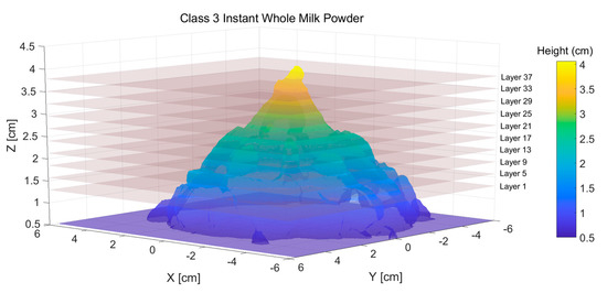 All contours (40 layers) for a Class 0 sample and a Class 3 sample are separately shown in Figure 9a,b. Note that the radius of the circle becomes increasingly smaller from the bottom to the top, which means that the bottom contour slices have more data than the top contour slices. Additionally, from Figure 9b, it is clear that there are more lumps on the bottom contour slices, which proves that the lumpiness tends to fall down the milk powder cone. It is also notable that all the contours of the Class 0 sample are more circular than the contours of the Class 3 sample, illustrating that the smoother the sample, the more circular the contours.