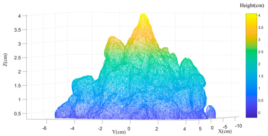 Figure 6 shows an example 3D reconstruction triangular mesh model which has around 500,000 triangles of a sample. From Figure 6, it is notable that if the milk powder sample has no lumpiness (perfectly smooth), the milk powder cone will be a near-perfect circular-based cone, which means that the top view of the contour extracted from the three-dimensional milk powder model will be a perfectly concentric circle. On the other hand, the contours will show fluctuations around the perfect circles if the sample’s surface is rough (with some lumpiness).