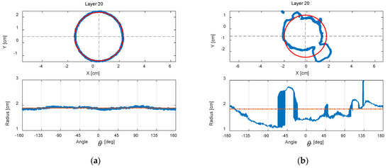 Figure 7a shows the unwrapped contour of a Class 0 milk powder sample at the middle layer (layer 20), while Figure 7b presents an unwrapped contour of the Class 3 milk powder sample at the middle layer (layer 20). The red circles in the figures are the least-squares circles fitted by the data of the 3D digital models in this layer. From these trends, it is clear that the contour of the smooth milk powder sample shows a near-perfect circle, and the unwrapped contour of the smooth sample shows a correspondingly near-straight horizontal line. Conversely, the contour of the Class 3 sample appears irregular, and the unwrapped contour of the rough milk powder sample exhibits considerable fluctuations.