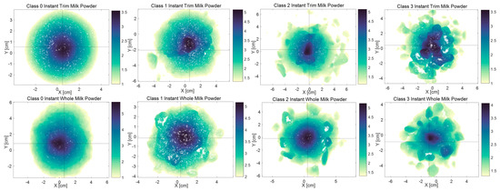 Table 1 shows the mean moisture values of all the moisture levels with standard deviation [48], while Figure 5 presents the front views of each sample [48]. Traill et al. [2] used photo standards to grade the surface roughness of milk powders by a trained sensory panel. Compared with the photo standards of lumpiness grades classified in [2], the original (first class) milk powder samples have a similar surface appearance to the level 0 dairy powders, and the rough (fourth class) milk powder samples have a similar appearance to the extreme appearance (level 14) of milk powders. Consequently, the original and rough milk powder samples are, respectively, referred to as Class 0 and Class 3. In addition, the smooth (second class) samples and the medium (third class) samples have a similar surface appearance to the moderate clumping samples (level 4–9) and the high clumping samples (level 9–13), separately. Thus, the smooth milk powder samples and the medium milk powder samples are separately denoted as Class 1 and Class 2.