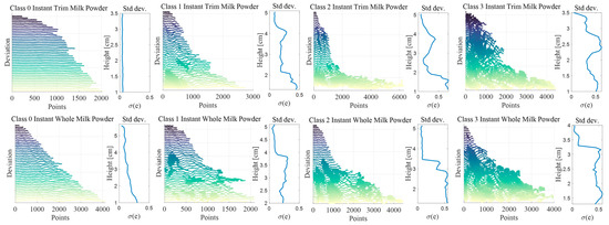 The deviations between the contours and the least-squares circles for each layer of Class 0–3 instant whole and trim samples are presented as a linear plot in Figure 11, and Figure 11 also plots the standard deviation for each altitude. A rough surface will have a higher standard deviation while the low standard deviation will be shown in the smooth surface, which is obvious in both the rough and smooth samples. For example, the standard deviations of the Class 0 cones are the lowest, while the standard deviations of the Class 3 cones are the highest. In addition, the Class 1 milk powder cones have a larger standard deviation than the Class 0 cones but a smaller standard deviation than the Class 2 milk powder cones. Additionally, the trends of the standard deviations in each Class milk powder cones are similar. Furthermore, since the lumpiness tends to fall down the milk powder cone, a higher variance is shown in the longer contours nearer the bottom.