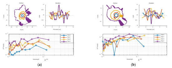 (a) The contours, deviations, and frequency response of a Class 0 sample; (b) the contours, deviations, and frequency response of a Class 3 sample.