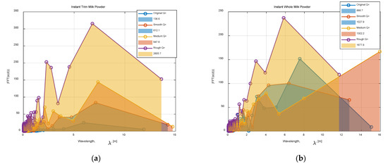 Figure 13a,b separately compare the contours, deviations, and frequency response of Class 0–3 instant whole and trim milk powder samples at layer 20 (approximately the middle of the cone). To clearly show the shape of each contour, the radii of Class 1–3 are enlarged appropriately (the radii of these four samples are very similar) in the contour plots of Figure 13. Additionally, the axis is truncated in the frequency response plots of Figure 13 since the high frequency (low wavelength) has little useable information. From Figure 13a,b, the Class 3 milk powder sample shows more energy at wavelengths (λ) around 10 distance units, and the milk powder samples with the rougher surface show more energy at the higher wavelengths, which is expected. Furthermore, Figure 14a,b, respectively, compare the frequency response of Class 0–3 samples with a linear scale because the differences in frequency response are reduced due to the logarithmic scale in Figure 13a,b. The Q values (the energy of the signal) of each sample in Figure 14a,b are computed by Equation (2), and as expected, the milk powder samples with smoother surfaces have lower Q values. This result proves that it is appropriate to use Q values as the tool to categorize the roughness of the milk powder samples.