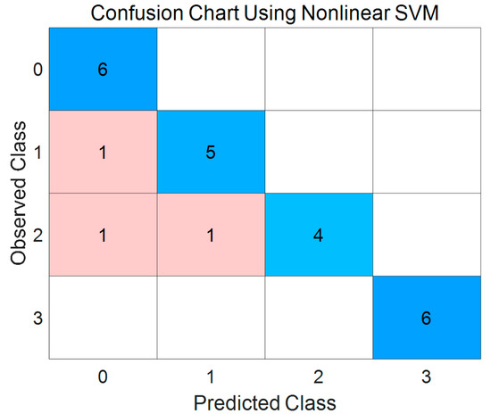 The SVM is a kernel-based method that is widely used to address pattern recognition problems [55] and binary classification problems [56]. To prevent overfitting, cross validation was used in this study. The data were separated into four subsets (each subset has 25% of the data). After trying different classifiers, a second-order polynomial nonlinear SVM classifier outperformed the others. Therefore, this SVM model was chosen to categorize the surface roughness of the samples. In addition, the confusion matrix [57], which is a classification assessment method [58], was utilized to assess the performance of the SVM classifier. The performance indicators, including specificity, overall accuracy, and sensitivity, are computed, and the detailed definition of these indicators is described in [59,60].