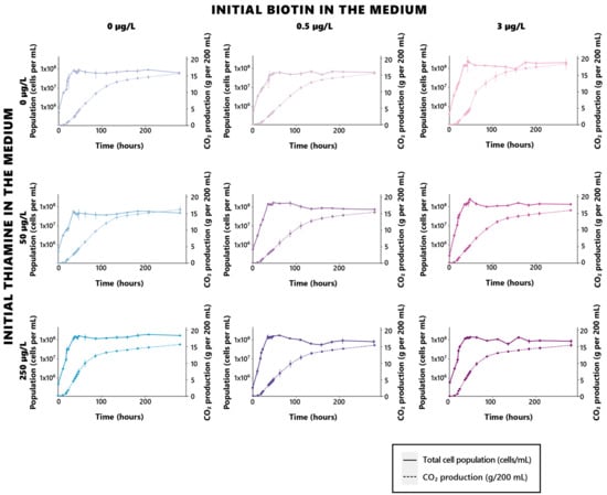 All in all, those results highlight the essential character held by biotin on yeast growth, allowing for it to reach sufficient population and rates for proper course of the biological processes. Similarly, thiamine’s significance in regard to fermentation [15] has been further assessed here, although a complete thiamine deprivation has been associated with maintained fermentation rates, possibly through the establishment of a survival strategy by the yeast, or the possibility that S. cerevisiae might have had some leftover inner thiamine resources that have allowed it to cope with thiamine deprivation.