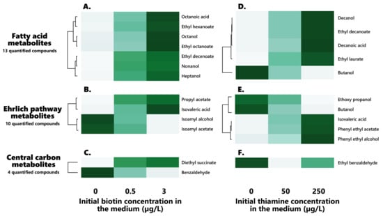 Hierarchical clustering of the biotin (left) and thiamine (right) significantly impacted volatile compounds in the final wines: effect of both vitamins on their profiles. (A–C): Biotin-impacted volatile compounds ((A): Fatty acid metabolites, (B): Ehrlich pathway metabolites, (C): Central carbon metabolites). (D–F): Biotin-impacted volatile compounds ((D): Fatty acid metabolites, (E): Ehrlich pathway metabolites, (F): Central carbon metabolites).