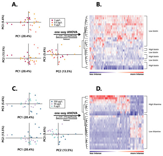 Similar to what was observed in the assessment of the influence of biotin on the yeast exometabolome, a high proportion of those features were significantly more intense in high thiamine, amounting to 378, while only 69 features appeared significantly more intense (p < 0.01) in low thiamine wines. Such a differentiation also appeared quite clearly through hierarchical clustering of these 515 total biomarkers, since it resulted in a distinct discrimination between high and low thiamine wines (Figure 3D), strongly testifying on the influence exerted by the vitamin on the wine exometabolome.