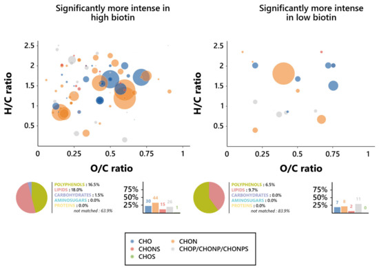 To further assess the nature of this influence, Van Krevelen diagrams were plotted on the features’ O/C and H/C ratios for both biotin conditions, and the elemental compositions of them were investigated (Figure 4). Notable differences in the chemical composition of wines appeared between the features associated with each biotin condition; as such, while high biotin-resulting wines displayed a dominance of CHON-based features, the predominating ones in low biotin wines were the phosphorus-containing features (CHOP, CHONP, and CHONPS). It is, however, relevant to note that those predominant features are, in either biotin condition, found in the lipid (O/C < 0.6 and H/C > 1.3) and polyphenol (O/C < 1.2 and H/C < 1.3) regions of the Van Krevelen diagram, consistent with their predicted chemical families [58]. In addition, an interesting influence exerted by biotin on the proportion in the CHONS features appeared here, since they dropped from 11.3% in high biotin to 6.5% in low biotin.
