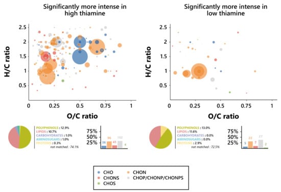 Metabolomic foot-printing of S. cerevisiae grown in high or low thiamine conditions based on LC-MS-MS untargeted analysis data. Van Krevelen diagrams based on the H/C and O/C atomic ratios for the significantly more intense features (extracted through ANOVA; p < 0.01), histogram proportion of their elemental compositions, and pie chart distribution of the predicted families for these biomarkers in high thiamine conditions (left, 378 markers) and low thiamine conditions (right, 79 markers). The point size indicates the relative intensity of the extracted masses.