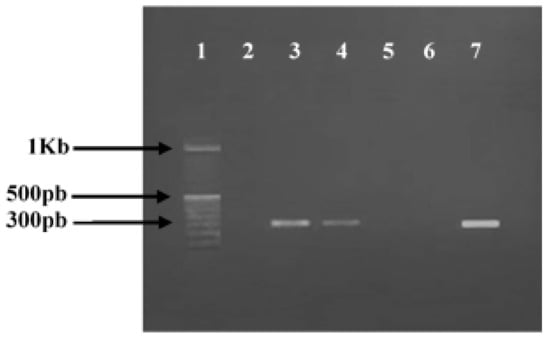 Figure 1. Agarose gel electrophoresis of polymerase chain reaction (PCR) amplification of mecA gene. Lanes 1, 100 bp DNA molecular size marker; lane 2, negative control; lanes 3–7, PCR amplicons obtained with DNA amplification of S. aureus strains, respectively: ATCC 43300 (Positive control); 896; 976″; 977″; 853.