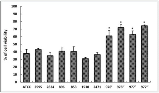Figure 3. Cytotoxic effects of foodborne S. aureus strains on HCT116 cells treated with different bacterial extracts for 24 h. Cell viability was determined using the MTT assay and expressed as percentages of viability. ATCC referred to the reference strain S. aureus ATCC 25923. Data are expressed as the mean ± SD. of three independent experiments. *: Values are significantly different (p < 0.05) from other strains.