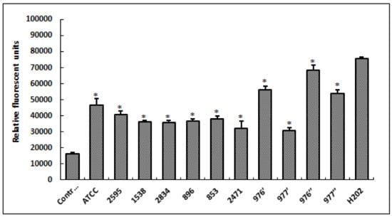 Figure 4. Levels of relative fluorescent DCF production, after 24 h of cell exposure to different S. aureus extracts. Fluorescent DCF is the result of DCFH oxidation by a variety of peroxides. H2O2, at 20 μM, was used as a positive control. ATCC referred to the reference strain S. aureus ATCC 25923. Data are expressed as the mean ± SD of three independent experiments. Values are significantly different (* p < 0.05) from control (untreated cells) and H2O2.
