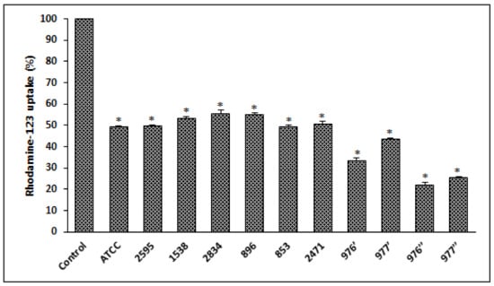 After cell exposure to different bacterial extracts, from different S. aureus strains, a significant decrease in MMP (p < 0.05) was observed compared to the control (untreated cells), indicating that mitochondria were depolarized (Figure 5).