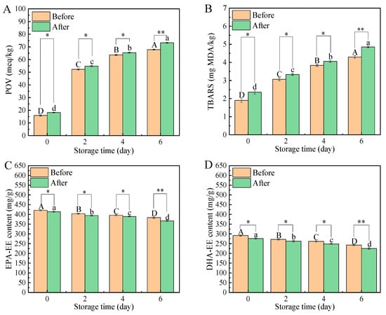 Effect of TPP added before or after the process of ethyl esterification on POV (A), TBARS (B), EPA-EE content (C) and DHA-EE content (D) of ethyl-esterified fish oils stored at 60 °C for different times. Values of different groups with different uppercase letters (A–D) or lowercase letters (a–d) are significantly different at p < 0.05; The asterisks (*) indicate the significant differences between the two groups with the same storage time at p < 0.05. The asterisks (**) indicate the significant differences between the two groups with the same storage time at p < 0.01.