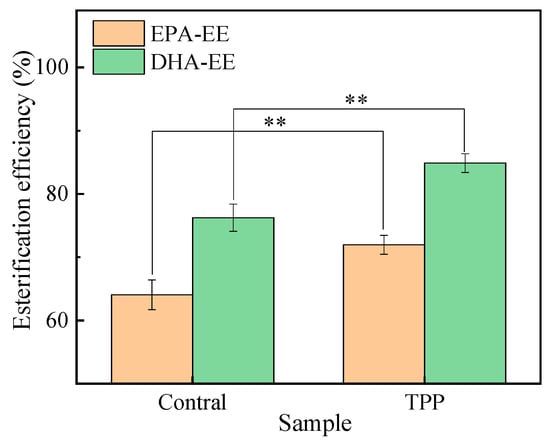 Effect of TPP on the esterification efficiency of fish oil in ethyl esterification. The asterisks (**) indicate the significant differences between the two groups supplemented with the different sample at p < 0.01.