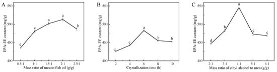 Effect of mass ratio of urea to fish oil (A), crystallization time (B) and mass ratio of ethyl alcohol to urea (C) on EPA-EE content of fish oils in the process of urea complexation. Values with different lowercase letters (a–d) in each panel are significantly different at p < 0.05.