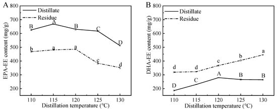 Effect of distillation temperature on EPA-EE content (A) and DHA-EE content (B) in distillates and residues after one-stage distillation. Values with different lowercase letters (a–d) or uppercase letters (A–D) are significantly different at p < 0.05.