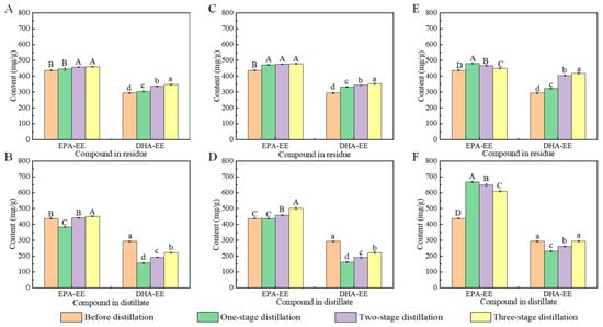 Effect of the number of stages in distillation on EPA-EE content and DHA-EE content in residues ((A) 85 °C; (C) 100 °C; (E) 115 °C) and distillates ((B) 85 °C; (D) 100 °C; (F) 115 °C). Values with different lowercase letters (a–d) or uppercase letters (A–D) are significantly different at p < 0.05.