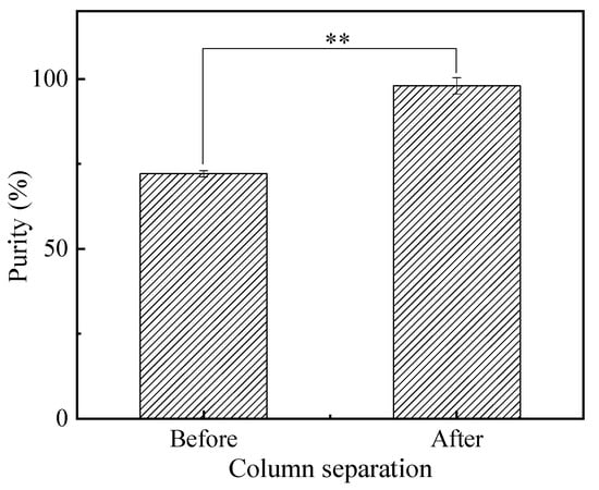The purity of EPA-EE detected with GC in distillates after treatment with column separation. The asterisks (**) indicate the significant differences between the two groups at p < 0.01.