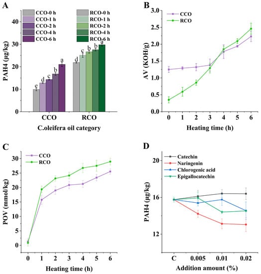 Changes of PAH4 in CCO and RCO heating for 6 h (A); The AV and POV changes of CCO and RCO during heating for 6 h (B,C); Effects of different addition of catechin, naringin, chlorogenic acid, and epigallocatechin on the formation of PAH4 in C. oleifera oil after heated at 180 °C (D). Bars with different letters show significant differences (p < 0.05).