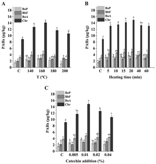 The PAH4 contents in C. oleifera oil at different heating temperatures under 0.01% catechin addition and 60 min heating time (A); The PAH4 contents in C. oleifera oil at different heating times under 0.01% catechin addition and 160 °C heated (B); and the PAH4 contents in C. oleifera oil at different catechin addition, heated at 160 °C for 60 min (C). Bars with different letters show significant differences (p < 0.05).