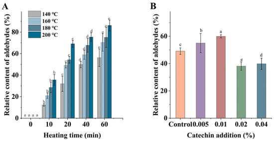 Relative contents of aldehydes in C. oleifera oil under different heating temperatures and times (A); Relative contents of aldehydes after adding different catechin addition and heated at 160 °C for 20 min (B). Bars with different letters show significant differences (p < 0.05).