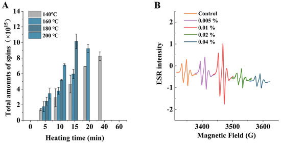 Total amounts of spin under different heating temperatures and times (A); ESR spectrum of different catechin addition at 160 °C for 20 min (B).
