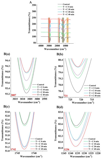 As shown in Figure 5A, the spectrum of triglyceride containing four major peaks near 3007, 1742, 1236, and 721 cm−1 showed the stretching vibrational positions of the unsaturated CH=CH, C=O stretching, C−O stretching, and CH=CH bending out of the plane, respectively; the two strong peaks near 2852 and 2921 cm−1 corresponded to the asymmetric stretching and symmetric stretching of −CH2, respectively; 1462 cm−1 corresponded to −CH2 bending; 1376 cm−1 corresponded to −CH3 bending; and 1119 and 1097 cm−1 both corresponded to C−O stretching [38]. In the figure, the higher the transmittance of the peak, the higher the contents of the specific functional groups. It was observed that the 2921 and 2852 cm−1 positions and transmittances of the samples, with and without catechin, were relatively stable after heat treatment because these two positions corresponded to the methyl and methylene groups, respectively, which are the most stable segments of triglycerides. It was also shown in several spectral bands studied that the transmittance of the peaks at 3007 and 721 cm−1 increased with heating time, and the spectra of the catechin-added samples showed higher transmittance than those of the non-catechin-added samples (Figure 5B). These results confirmed the degradation and oxidation of the lipids occurred during heating, more hydrolysis and oxidation reactions occurred in the functional groups of the oil samples, and the added catechin at high temperature that may be coupled with oxygen reduction to produce reactive oxygen species, such as hydrogen peroxide and hydroxyl radicals, causing oxidative damage to lipids. This result was consistent with the result of Section 3.3 in this study.