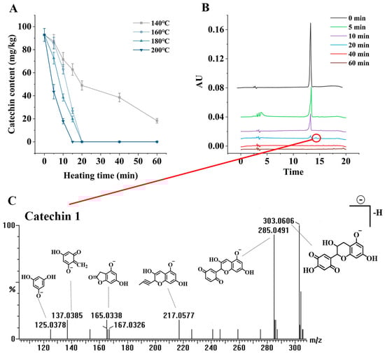 Contents of catechin at different temperatures with heating time (A); Chromatograms of catechin and catechin 1 at 160 °C for different heating times (B); Mass spectrum of catechin 1 and speculated fragment structure (C).