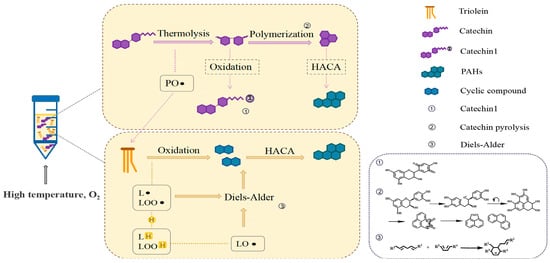 Previously, numerous studies have shown that phenolic compounds can inhibit the formation of PAHs due to their antioxidant properties [6]; however, it was found that the contents of phenolic compounds, phytosterols, and another lipid companions in C. oleifera oil extracted by the hot pressing process increased with an increase in temperature, while the contents of Benzo(a)pyrene (BaP) also increased [7]. There are also studies found where the contents of PAH8 [sum of benzo(a)anthracene, chrysene, benzo(b)fluoranthene, benzo(k)fluoranthene, benzo(a)pyrene, dibenzo(a,h)anthracene, benzo(g,h,i)perylene, and indeno(1,2,3-c,d)pyrene] in chargrilled chicken wings marinated with black tea high in phenolic contents were much higher than that in control groups [8]. Min et al., as well as others, found higher levels of PAH8 in their heated meat model system than in the control group when EGCG [(−)-epigallocatechin gallate] was used as an antioxidant at concentrations of 50 μg/kg and 100 μg/kg [9]. We also found in this study that the rate of increase of PAHs in crude camellia oil (CCO) was faster than that in refined camellia oil (RCO) under the same heat treatment conditions. Therefore, we speculated whether some substances in the CCO caused an increase in PAHs after heat treatment. Based on this, we found that many studies pointed out the presence of the precursors of PAHs in food, such as amino acids, lipids, polyphenols, cellulose, etc. These precursors may undergo condensation polymerization to form PAHs under high-temperature conditions [10,11].