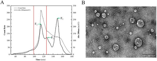 Three eluents, F1, F2, and F3, were separated and collected in the range of 100 to 160 min, among which F1 in the range of 100 to 120 min had a stronger signal of light scattering intensity than other eluents (Figure 1A). As shown in Table 1, the average hydrodynamic diameters of F1, F2, and F3 were 255 nm, 220 nm, and 147 nm, respectively, and the light scattering intensity in F1 was roughly three times greater than in F2. It has been indicated that larger particle sizes of CNPs are more efficiently phagocytosed by macrophages []. The minimum PDI of F1 indicated a narrow sample size distribution, while the particles in F2 and F3 may not have a uniform size. The maximum negative ζ-potential of F3 indicated a greater ionic bond interaction with the chromatographic gel, resulting in a delay in separation. The TEM micrograph of F1 confirmed that the particles contained in F1 had a uniform spheroid shape (Figure 1B). Thus, the representative F1 was chosen to learn the nano-functional properties of the CNPs from duck soup.