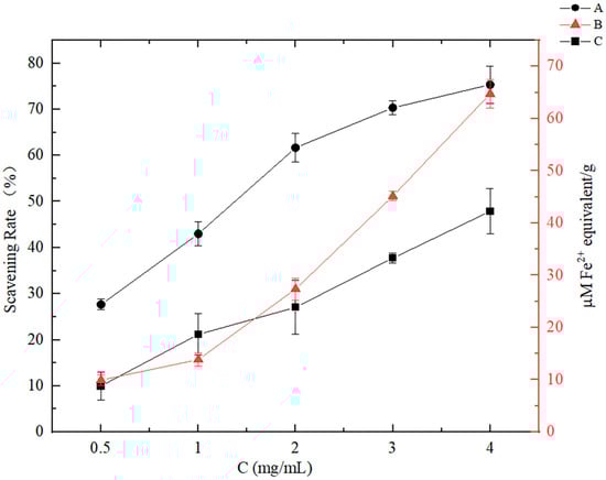 The ABTS free radical scavenging capacity of CNPs was evaluated based on a published method, with slight modifications []. The ABTS powder was weighed and prepared to 7 mM, and the potassium persulfate reagent was weighed and prepared to 140 mM. Then, 5 mL of ABTS solution was mixed with 88 μL potassium persulfate solution and placed away from light for 12–16 h. The mixture was then diluted 50 times, with distilled water as the ABTS+ reserve solution. The ABTS+ reserve solution (200 μL) and the sample solution (50 μL) were absorbed and added into the enzyme-labeled plate. The absorbance was measured at 734 nm after standing for 10 min in a dark environment at room temperature, and the measurement was repeated 3 times. The reported method was used to test the ferric reducing antioxidant power (FRAP) of the CNPs []. The 100 mM FeSO4·7H2O solution was diluted with deionized water to 0.15, 0.30, 0.60, 0.90, 1.20, and 1.50 mM as the standard for calibration curves. Samples (5 μL) and FeSO4·7H2O standard (5 μL) were added into 96-well plates in equal quantities, then FRAP solution reagent (5 μL) was added into each well and incubated at 37 °C for 5 min, and distilled water (5 μL) was used as the control. Finally, absorbance was measured at the wavelength of 593 nm, and test temperature was set at 37 °C, and the measurement was repeated 3 times. The DPPH radical scavenging ability of CNPs was tested, the published method was slightly modified (the ratio of DPPH solution to sample solution was 1:1, 100 µL) []. The 0.1 mM DPPH solution (100 μL) and sample solution (100 μL) were absorbed, then added to 96-well plates and mixed. After being kept in dark for 30 min, the plate was placed on the enzyme label analyzer, the absorbance was recorded at 517 nm, and the measurement was repeated 3 times.