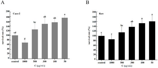 There was no significant difference in cell activity between the CNP treatments and the control, indicating that CNPs had no significant toxicity to Caco-2 cells (Figure 3A) or Raw 264.7 cells (Figure 3B), and could significantly promote the growth and proliferation of these cells when the concentration was 50–300 µg/mL. However, when the concentration of CNPs gradually increased; as can be seen from Figure 3, the cell activity showed a trend of decline.