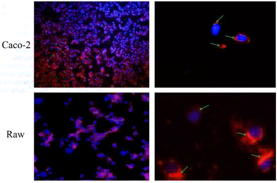 Observation of direct effects of Caco-2 cells and Raw 264.7 on the CNPs. The two images on the left are panoramic views, while the two images on the right are partial views. The nuclei were stained blue, while the CNPs were stained red. After incubation, the CNPs wrapped around the nucleus, as indicated by the green arrow.