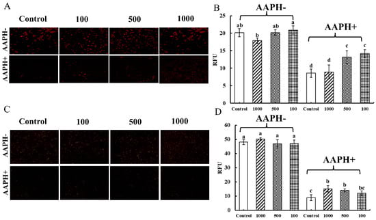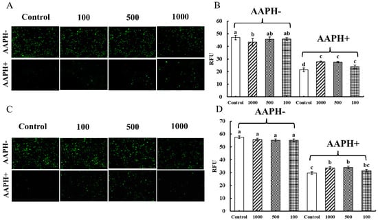 In the absence of AAPH-induced cell damage (AAPH-), the fluorescence intensity of the groups in Caco-2 cells with additional CNPs was comparable to that of the control group, with no discernible differences based on the green fluorescence of DiBAC4(3) in Figure 5A. The relative fluorescence units (RFU) of Caco-2 cells were found to be much lower than those of the control group when the concentration of CNPs was 1000 µg/mL, as shown in Figure 5B. In Raw 264.7 cells, it was noticed that the fluorescence intensities of the groups with additional CNPs did not change substantially from that of the control group, based on the green fluorescence of DiBAC4(3) in Figure 5C. Moreover, the RFU of the groups added with various concentrations of CNPs did not differ noticeably from the control group in Figure 5D.