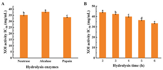 The inhibitory activity against xanthine oxidase with various hydrolysis enzymes and hydrolysis times of small yellow croaker hydrolysates (SYCHs). (A) Xanthine oxidase inhibitory (XOI) activity IC50 of various hydrolysis enzymes in SYCHs for 6 h. (B) XOI activity IC50 of papain SYCH. Data are shown as the mean ± standard deviation (n = 3), and different letters (a–e) among samples indicate significant differences (p < 0.05).
