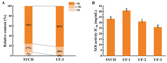 Molecular weight (MW) and XOI activity IC50 of papain hydrolysates from small yellow croakers at 6 h. (A) MW distributions and relative contents of different samples. (B) XOI activity IC50 of SYCH and three fractions after ultrafiltration. Different letters (a–d) among samples indicate significant differences (p < 0.05).