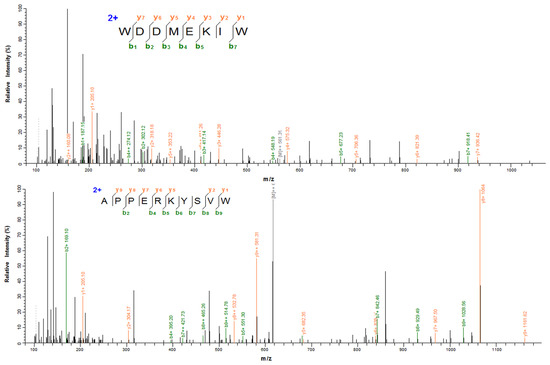 Seven peptides (WDDMEKIW, APPERKYSVW, IADRMQKELT, LNSADLIK, LSNLGIVI, IGALRAVA, and HHTFYNELR) derived from SYC were obtained and their activity values, hemolysis, and toxicity were predicted. Their basic data (AA sequence, MW, PI, predicted activity values, hemolysis, toxicity, and IC50 for XOI activity) are summarized in Table 3. According to Table 3, all of the peptides had a molecular weight between 760 and 1250 and were predicted to be non-toxic. Only WW8 and AW10 were predicted to have higher potential physiological activity, and all were non-hemolytic except LSNLGIVI and LNSADLIK. The results indicated that WW8 and AW10 (the identification results in Figure 3) are non-toxic and non-hemolytic and have potential physiological activity. WW8 and AW10 presented adequate water solubility. Water solubility has been found to have an effect on bioactive peptide absorption, and dissolution is a limiting factor for physiological function performance [39]. Peptides with considerable water solubility may have high biological availability [15,40]. The XOI activities of the peptides were highest in WW8 (IC50 = 3.16 ± 0.03 mM) and AW10 (IC50 = 5.86 ± 0.02 mM), as shown in Figure 4. The results showed a higher XOI effect than peptide ACECD from Skipjack tuna hydrolysates, which had XOI activity of IC50 of 13.40 mM [13]. IADRMQKELT and LNSADLIK had no XOI activity at 15 mg/mL, and LSNLGIVI, IGALRAVA, and HHTFYNELR did not even dissolve in water at 3 mg/mL, so these five peptides were neglected for the subsequent experiments.