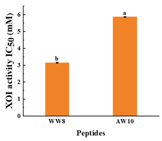 XOI activity IC50 of two synthesized XOI peptides. Data are shown as the mean ± standard deviation (n = 3), and different letters (a and b) among the samples indicate significant differences (p < 0.05).