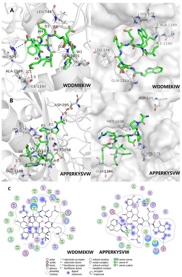 The molecular docking analysis of the synthesized peptides with xanthine oxidase (XO). (A) Molecular docking of the peptide WDDMEKIW with XO. (B) Molecular docking of the peptide APPERKYSVW with XO. (C) The binding and interaction visualization of peptides with XO.