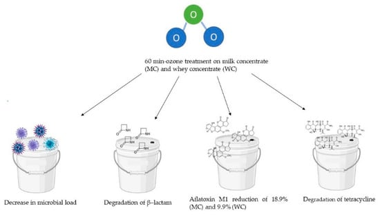 - Sert, D.; Mercan, E. Effects of Ozone Treatment to Milk and Whey Concentrates on Degradation of Antibiotics and Aflatoxin and Physicochemical and Microbiological Characteristics. LWT 2021, 144, 111226. [Google Scholar] [CrossRef]