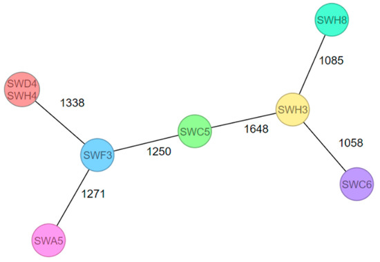 cgMLST MST of eight L. monocytogenes isolates from drains (SWH8, SWC6, SWH3, SWC5, SWF3, and SWA5) and from processing water for a salad-washing system (SWD4 and SWH4). The allele distances are indicated. Identical isolates are grouped within a common circle.