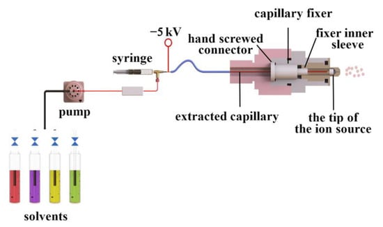 In recent years, mass spectrometry was widely used in the analysis of active metabolites in ginseng samples due to its advantages of high sensitivity, fast analysis speed, and less sample consumption. According to the principle of mass spectrometry, the identification of the characteristic components of different ginsenosides is the premise for the identification of ginsenoside metabolites [5,6,7]. Liquid chromatography (LC) and liquid chromatography-mass spectrometry (LC-MS) [5,8,9,10] are the main analytical techniques for ginsenosides detection and analysis, but these two methods require complex sample pretreatment that is time-consuming and laborious and may lead to loss of active components in the sample. Ginsenosides can also be detected with electrospray ionization mass spectrometry (ESI-MS) [11,12], but this method is not conducive to the direct analysis of complex matrices, such as ginseng, due to its strong background interference and low sensitivity. Electrospray desorption ionization (DESI) [13,14] and real-time direct analysis mass spectrometry (DART-MS) [15,16,17] have the advantages of no sample pretreatment and fast analysis speed and are used for the composition detection of ginseng samples. However, these two methods are limited to the analysis of a sample’s surface and do not detect its internal components. Therefore, it is very important to develop a rapid and sensitive internal information acquisition method without sample pretreatment. Recently, Zhang et al. developed an internal extractive electrospray ionization mass spectrometry (iEESI-MS) method [18], and Xu et al. used iEESI-MS to analyze six β-agonists in pork tissue samples [19]. Zhang et al. used iEESI-MS to successfully detect amino acids and sugars in garlic, strawberry, and other plant samples [20,21]. This method can directly obtain the internal information of tissue samples without sample pretreatment, hence avoiding the possible loss of component information and realizing the advantages of fast and real-time analysis. The method was applied in food science, plant metabolite analysis, and other fields [22].