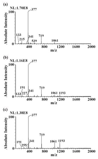 Figure 2 shows the mass spectrum fingerprints of the ginseng under forest, Panax quinquefolium (Canada), and Panax quinquefolium (Jilin) samples under the detection solvent analyzed with iEESI-MS. Dominant mass peaks, including m/z 341, m/z 377, m/z 719, and m/z 1061, were found in the mass spectra obtained from all the ginseng samples. In Figure 2a, the characteristic mass peak m/z 539 was present, but there was no mass peak m/z 1193 [24], as shown in Figure 2b,c. Thus, the chemical fingerprints of the three different ginseng samples were similar to each other, but diversity could also be recognized in some metabolites.