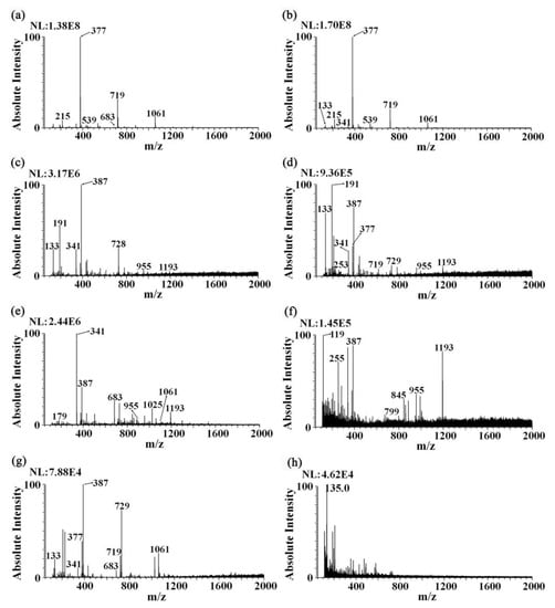 The fingerprint spectra of different solvents for the detection of ginseng under forest samples detected with iEESI-MS. (a,c,e,g) in the left column correspond to the fingerprint spectra of the ginseng under forest samples under 0.5 mM ammonium chloride in methanol, 0.1% formic acid in water/ethanol (v:v = 1:1), 10 mM ammonium acetate in acetonitrile/methanol (v:v = 1:1), and 0.1% formic acid in acetonitrile/ethanol (v:v = 1:1) solvents, respectively; (b,d,f,h) in the right column correspond to the fingerprint spectra of the ginseng under forest samples extracted sequentially in 0.5 mM ammonium chloride in methanol, 0.1% formic acid in water/ethanol (v:v = 1:1), 10 mM ammonium acetate in acetonitrile/methanol (v:v = 1:1), and 0.1% formic acid in acetonitrile/ethanol (v:v = 1:1) solvents, respectively.