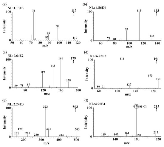 Figure 4 shows the MS2 spectra of the active metabolite components measured in the samples. In the MS2 spectrum of m/z 117→, the fragment ions at m/z 99 and 73 were observed (Figure 4a), which corresponded to [M-H-H2O]− and [M-H-CO2]−, respectively. Therefore, m/z 117 was assigned to succinic acid. In the MS2 spectrum of m/z 133→, the fragment ions at m/z 115 and 97 were observed (Figure 4b), corresponding to [M-H-H2O]− and [M-H-2H2O]−, respectively. Therefore, m/z 133 was assigned to malic acid. In the MS2 spectrum of m/z 179→, the fragment ions at m/z 161, 143, and 119 were observed (Figure 4c), corresponding to [M-H-H2O]−, [M-H-2H2O]−, and [M-H-C2H4O2]−, respectively. Therefore, m/z 179 was assigned to fructose. In the MS2 spectrum of m/z 191→, the fragment ions at m/z 173 and 111 were observed (Figure 4d), corresponding to [M-H-H2O]− and [M-H-2H2O-CO2]−, respectively. Therefore, m/z 191 was assigned to citric acid. In the MS2 spectrum of m/z 503→, the fragment ions at m/z 341, 323, and 179 were observed (Figure 4e), corresponding to [M-H-Glc]−, [M-H-H2O-Glc]-, and [M-H-2Glc]−, respectively, or corresponding to [M-H-Ara-CH2O]−, [M-H-H2O-Glc]−, and [M-H-2Glc]−, respectively, Therefore, m/z 503 was assigned to raffinose or isoconiferoside. The addition of ammonium chloride to the solvent methanol (0.5 mM ammonium chloride) also led to the formation of a chlorination peak for some of the active components. The peak at m/z 215 corresponded to the chloride adduct; the loss of HCl led to the deprotonated molecule of fructose m/z 179. The chloride anions were produced via the electrochemical reduction of chlorinated solvents at the ESI capillary, as reduction processes were inherent to the negative ion ESI process, leading to the formation of chloride adducts [M+Cl]−, which competed with the formation of the deprotonated molecules [M-H]−. The relationship between the two species was a difference of 36 Da [24], as shown in Figure 4f.