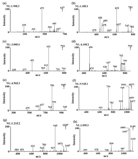 Tandem MS analysis of typical ginsenosides in ginseng under forest and two Panax quinquefolium samples detected with iEESI-MS: (a) MS2 spectrum of m/z 637→, (b) MS2 spectrum of m/z 783→, (c) MS2 spectrum of m/z 793→, (d) MS2 spectrum of m/z 799→, (e) MS2 spectrum of m/z 945→, (f) MS2 spectrum of m/z 1077→, (g) MS2 spectrum of m/z 1107→, and (h) MS2 spectrum of m/z 1149→.