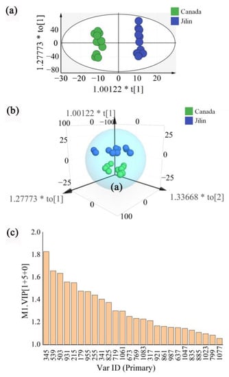 Scatter plot of OPLS-DA scores of two Panax quinquefolius samples detected using sequential iEESI-MS: (a) score scatter plot of the 2D OPLS-DA model, (b) score scatter plot of the 3D OPLS-DA model, and (c) bar plot with the OPLS-DA model of the VIP.